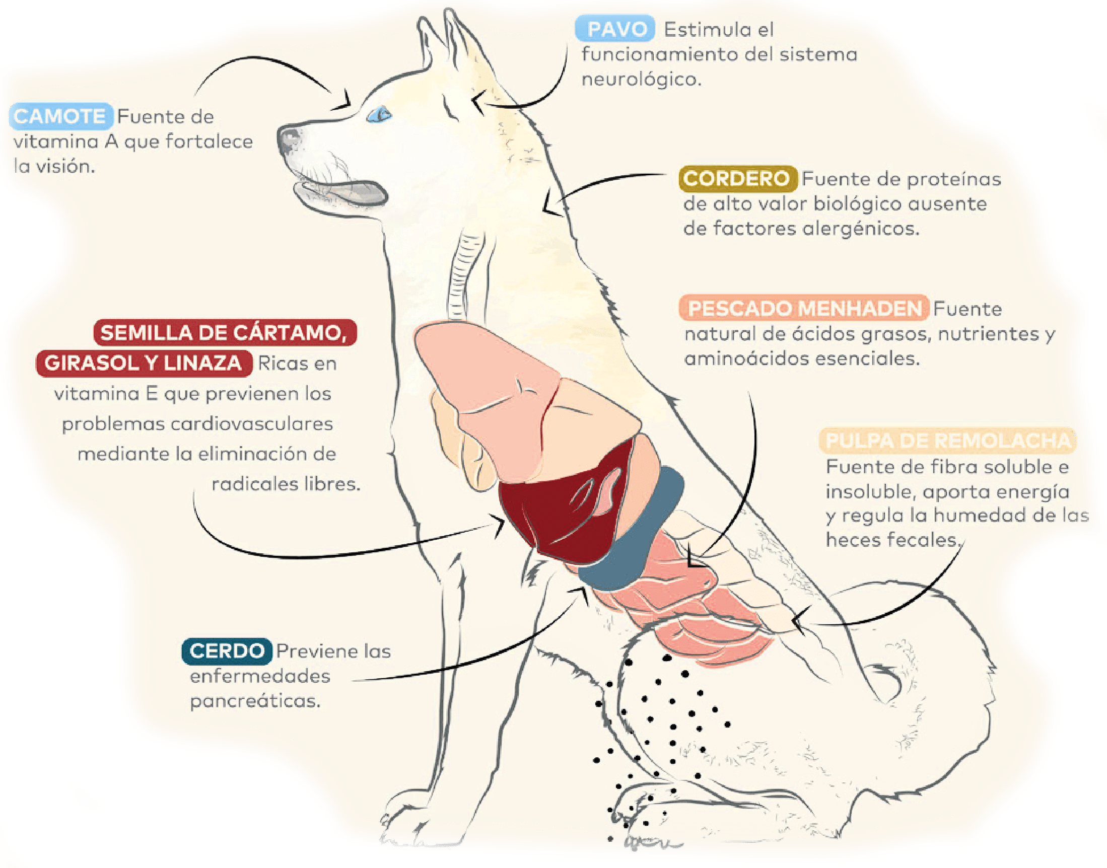 Nuestras recetas están elaboradas con deliciosos ingredientes y proteínas de alto valor biológico, como lo son: cordero, salmón, cerdo, pavo y pescado, que aportan nutrientes, mejoran la digestión y la salud en general; libres de saborizantes, aromas, colorantes artificiales, conservadores y químicos, regresando a lo natural como tu perro comería en un hábitat silvestre.